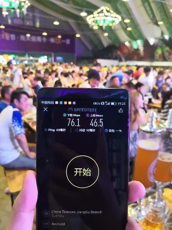 7月20日开幕式当晚,会场内电信用户近万人,主要集中在舞台与啤酒大棚内,现场测试表明,下载峰值速率可达到76.1Mbps,上行速率达到46.5Mbps,未出现网络拥塞情况,用户体验得到了有效保障。