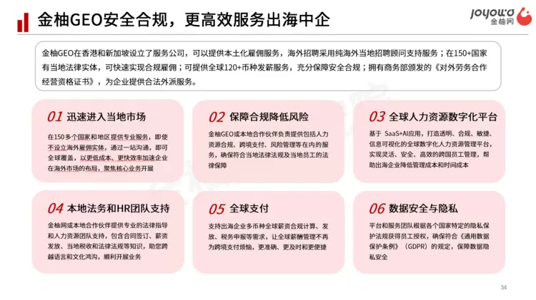金柚GEO是金柚网海外业务全球总部,为企业提供全球数字化人力资源服务,助力加速出海并实现海外业务的稳定发展。涵盖海外招聘、全球EOR、全球Payroll、海外员工派遣、全球自由顾问用工服务等一站式全球人力资源服务,覆盖亚太、美洲、欧洲、中东、非洲等区域,在香港、新加坡等地设有自营公司,支持150多个国家和地区的业务需求。目前已为物流仓储、智能制造、生物医疗、信息技术、跨境电商等行业的头部企业提供服务。