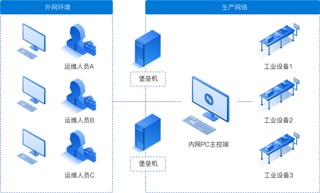 如果是异地的运维需求或者是外部供应商需要接入,则可以通过堡垒机访问安装了主控端的内网电脑,实施远程运维和调试。这样的部署方式下,远程控制方案完全处于内网环境,外部接入的权限一定程度上收窄,并由堡垒机统一管理,这更符合制造业的安全合规需求;同时堡垒机不会再被单一远程接入需求占用,负担大大降低。