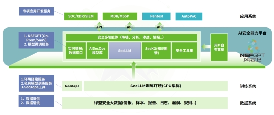 2023年9月,绿盟科技首批发布了安全垂直领域大模型——风云卫AI安全能力平台(NSFGPT),致力于重塑传统网络安全运营模式,通过深度整合人工智能与安全领域的专业知识,应对日益严峻的网络威胁挑战。一年来,绿盟科技始终坚持在“AI+安全”领域的技术创新和资源投入,打磨核心场景、锤炼关键能力,实现在安全运营、安全监测、安全攻防和威胁情报等多个场景的智能化融合,孵化出安全专业领域大模型产品和解决方案并服务于重点行业用户。