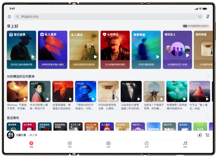 在华为Mate XT非凡大师上使用网易云音乐,能够获得比普通手机更为沉浸的视听感受。无论展开双屏还是三屏,网易云音乐都能自适应页面大小,在屏幕左侧显示精美的黑胶封面大图,右侧同步呈现歌词,再配合多样化的播放器样式,用户在聆听音乐的同时,也能沉浸在美妙的视觉艺术中。此外,超大屏幕还可容纳更多音乐内容推荐,无需多次滑动即可把更多好音乐尽收眼底。