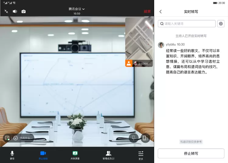 在线上会议过程中,用户经常需要投屏各种分享材料,普通手机较小的屏幕难以清晰呈现投屏内容。而在华为Mate XT非凡大师的三屏形态下使用腾讯会议时,不仅会议画面和工具栏更加清晰、操作更便捷,还能与其他应用同时运行,且支持自由调整分屏比例,方便用户调用发言材料,或与同事保持沟通。此外,在分屏模式下,腾讯会议可以在屏幕左侧显示会议实况,右侧同步进行语音转写及智能摘要,帮助用户轻松搞定会议记录,关键信息一目了然。