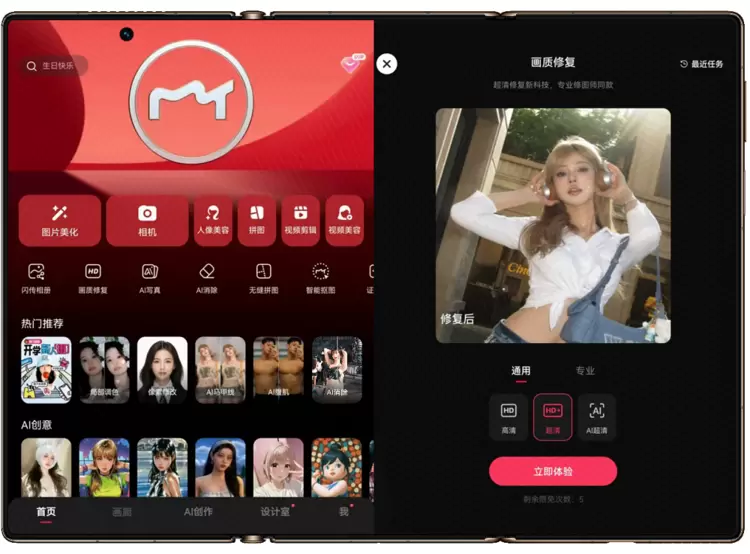 用户在日常用手机自拍时,经常需要调整拍照角度以获得更好的构图,后期修图时也必须来回放大/缩小照片,才能完成对细节的调整。美图秀秀和美颜相机在适配华为Mate XT非凡大师后,针对折叠、双屏,以及三屏形态都作出了界面优化,展开后会自动切换至宽屏模式,为用户提供更好的自拍画面预览;修图时,各类功能模块布局也不再拥挤,照片无需反复大小就能轻松看清每一处细节,修图更加得心应手。