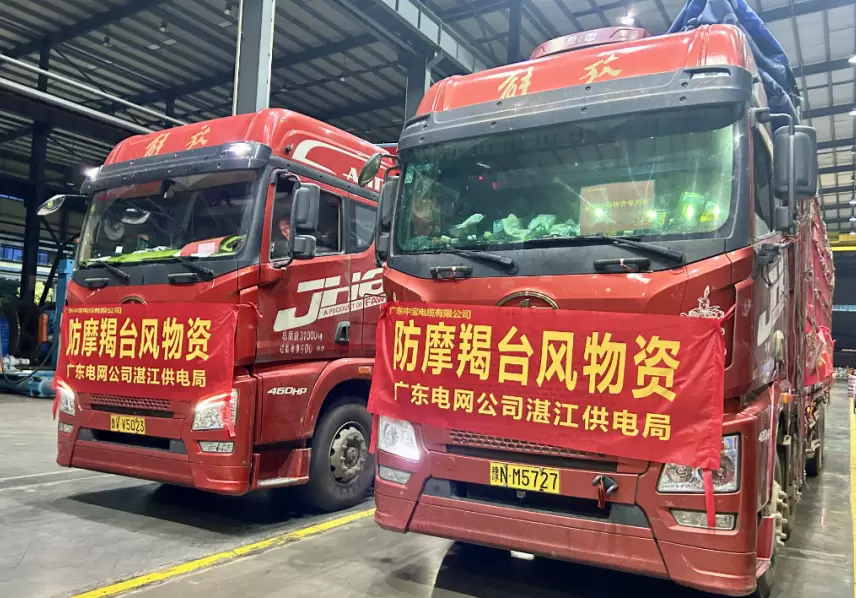 广东中宝电缆有限公司是南方电网合格且中标的供应商,于2024年9月5日下午4时,接到广东电网及广西电网250公里应急线缆物资调拨的通知,公司在5分钟内启动应急预案,30分钟内应急管理人员及6台的应急运输车辆就位,2小时内全部应急库存线缆按用户需求数量装车完毕,连夜紧急出发,于9月6日零晨,抢在“摩羯”登陆前的6小时,分别送达广东电网湛江供应电局(徐闻及雷州)、广西电网贵港供电局。