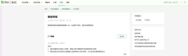 作为一个多功能的无代码平台,草料不局限于特定场景,用户可以根据不同的需求构建多样化的应用。草料社区为这些来自不同行业的用户提供了一个交流的平台。有的用户会主动分享自己的使用经验、与同行交流应用落地思路;也有用户吐槽不好的体验,督促草料产品经理尽快开发新功能,推动产品的持续改进。