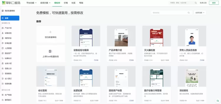 以物业行业为例,用户可以快速浏览其他物业单位的二维码应用经验,通过一键应用模板,轻松实现灭火器巡检、访客出入登记、小区介绍等多种物业场景相关需求。极大地提高了工作效率,让用户轻轻松松“抄作业”。