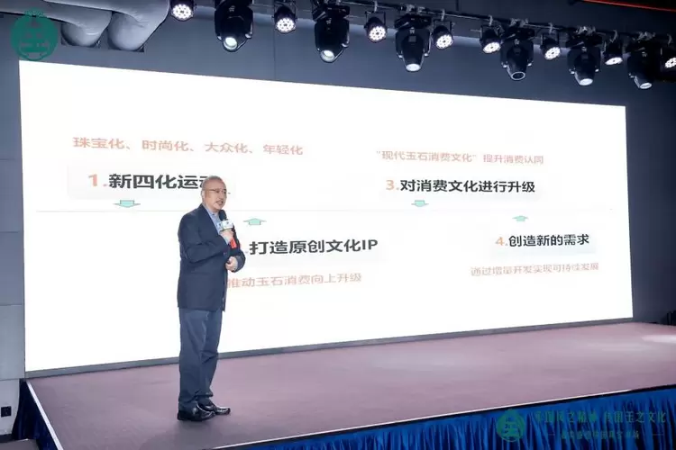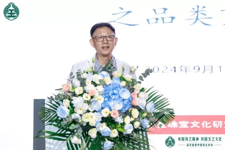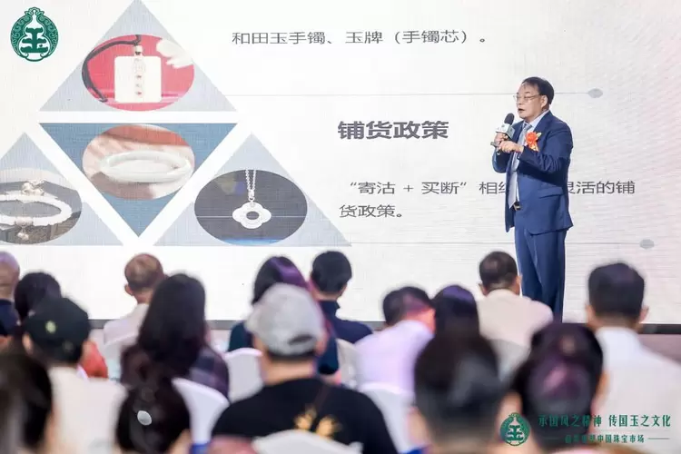 东方瑞璐文化发展(北京)有限公司董事长陈汉义则带来了《玉石产业IP化发展的创新与实践》的主题演讲。他阐述了玉石产品创新研发的重要性,并分享了如何通过市场扩刚需来拉动进店流量,进而产生新的利润增长点。陈董分享说,用婚庆刚需的底层逻辑,以玉石和黄金为载体,全面复兴中华亲情信物,持续挖掘新刚需,扩展黄金珠宝的刚需消费,有效对冲了婚庆刚需的下滑,是振兴珠宝大类的新生力量。