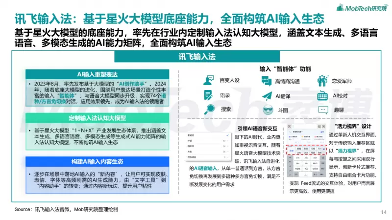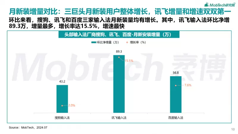 最新数据显示,讯飞输入法环比净增89.3万,增量最多,增长率达15.5%,增速最快。报告分析,讯飞输入法基于星火大模型的底座能力,率先在行业内定制输入法认知大模型,涵盖文本生成、多语言语音、多模态生成的AI能力矩阵,构筑起AI输入生态。24年,讯飞输入法围绕用户表达场景打造个性丰富的输入“智能体”;伴随语音大模型的升级,实现74个语种/方言免切换对话,应用效果领先,成为AI输入法的领跑者。