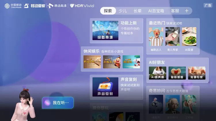 移动高清是移动爱家品牌旗下的优质电视产品,具备内容全、速度快、操控智三大业务优势,提供看、学、动、听、玩全家庭场景互动娱乐服务。值此中秋佳节,为营造轻松、欢乐的节日氛围,移动高清电视推出“趣话中秋乐,天涯共此时”全网活动,通过HDR Vivid超高清技术、AI大模型等技术能力,为用户带来丰富多元的观看和互动体验,为家人团聚时光增添无限乐趣。
