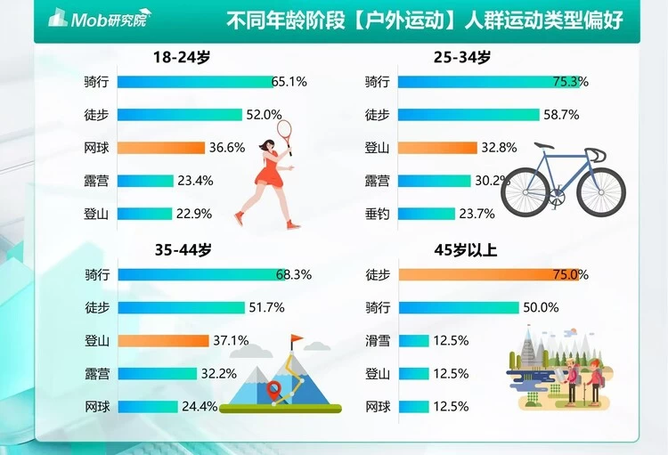 又到秋高气爽时节,无论是傍晚的城市,还是周末的郊野,装备各异的骑行大军又壮大起来。近日Mob研究院联合库润数据发布《2024年户外运动人群洞察报告》,调查显示98.8%的人尝试过休闲户外,骑行、徒步、登山是他们最常进行的户外运动。而在“你是早八骑行僧还是佛系徒步人?”的问题中,选择“骑行”作为首个运动偏好,覆盖几乎18到45岁之间的全部年龄段。