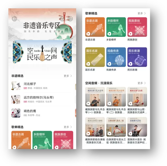 经过前期的内容收集和整合,华为音乐于2024年7月正式上线非遗音乐专区,涵盖非遗古调、民族原创、名家戏曲、新民乐等各类精选民族音乐。目前华为音乐已通过和未来东方、瑞鸣音乐、看见音乐、声音丛林、宇歌文化等音乐厂牌合作,上线非遗古调、民族原创、乡韵情怀、戏曲传承、国乐名家、民乐新潮等多品类歌单;同时还推出“空间民乐之声”等精品内容策划,将配器元素丰富的民族音乐和空间音频技术相结合,让作品听感更细腻、更沉浸、更加还原出民族旋律中演绎的地域文化和生活场景,以空间音频技术的加持,对传统音乐文化进行创新传承。