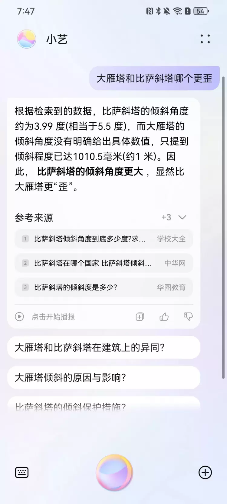 确定好目的地之后,到底怎么玩?对大多数人来说,既要规划详细、又要细节不出纰漏的“完美旅行攻略”非常费时费力。而小艺可以从特色景点、住宿、餐饮、注意事项等多个维度出发,结合用户确定的旅行目的地,为你解答各种旅行知识,堪称旅行界的百科全书。用户只需长按华为手机电源键或者对手机说“小艺小艺”即可唤醒小艺,不论是询问当地的人文知识、历史典故,还是推荐热门景点、美食小吃,小艺都能对答如流,帮助大家更快速了解目的地的相关信息。比如你可以直接问它“为什么景德镇的瓷器很出名”、大雁塔和比萨斜塔哪个更歪”“为什么很多人喝不惯北京豆汁儿”,通过各种问题逐渐了解到目的地的各种信息,帮助提升旅行体验。