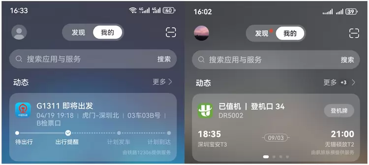 假期出行高峰期,高铁飞机可能会晚点、延误,出行信息繁多且易忘。华为负一屏提供的实时动态卡片就非常实用。在负一屏打开航班、火车服务通知,绑定账号后,只需手机桌面右滑至负一屏,即可查看12306火车或航旅纵横航班实时动态,辅助旅途中行程安排准确及时、防止遗忘重要信息。