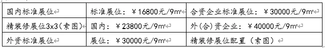 1、标准展位9m²(3m×3m);配置:展出场地、三面展板(高2.5m)、一块中英文楣板 、一 张洽谈桌、二把椅子、地毯、220V电源插座一个、二支射灯。(注:双开口展位加收20%)
