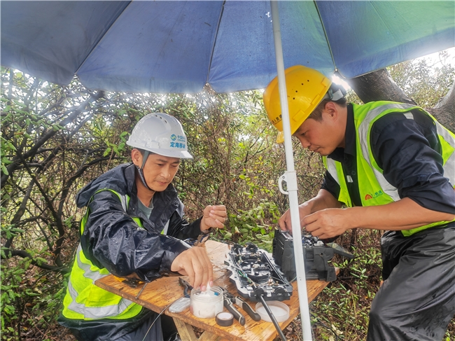 受台风影响,9月15日17:30,定海峙岙塘机房的光缆中断,舟山移动迅速组织抢险人员通过临时调度恢复传输业务。9月16日7:00,在台风过境后,抢修人员即刻至对面山上进行光缆抢修,迅速恢复业务。