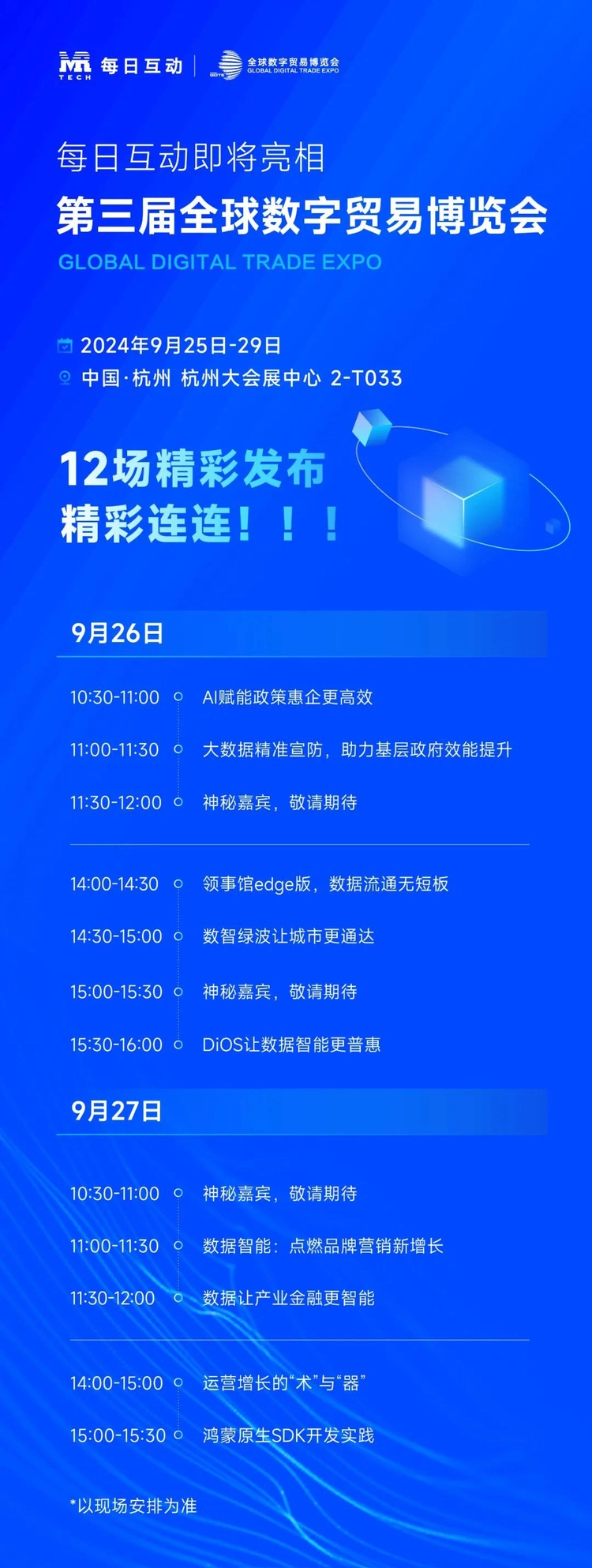 9月25日至29日,第三届全球数字贸易博览会(数贸会)的大幕将正式拉开。杭州这座被誉为“数字经济第一城”的城市,正以其开放的姿态、创新的精神、合作的诚意,迎接全球嘉宾的到来。本届数贸会由浙江省人民政府与商务部主办,以“数字贸易 商通全球”为主题,旨在构筑一个以“国家级、国际化、数贸味”为核心的专业交流展示平台。每日互动作为一家专业数据智能服务商,受邀参与本次盛会(2号馆T033展位),与全球伙伴共同探讨数据智能的未来。