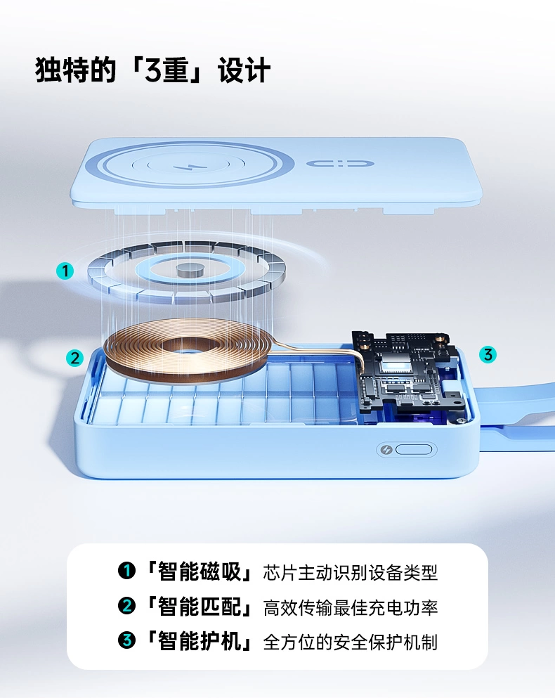 首先从技术上看, MagTrinity 磁吸技术作为罗马仕独家新一代的磁吸解决方案,拥有独特的三重设计:智能磁吸、高效率无线能量传输以及全方位的保护机制。该技术采用先进的电磁感应原理与优化的电路设计,实现了快速而稳定的电力传输。同时,内置了智能芯片能够自动识别设备类型,调整至最适充电功率,既保障了电池健康,又避免了过热风险,延长了设备使用寿命。真正打破了不同产品间的磁吸壁垒,支持多设备磁吸。