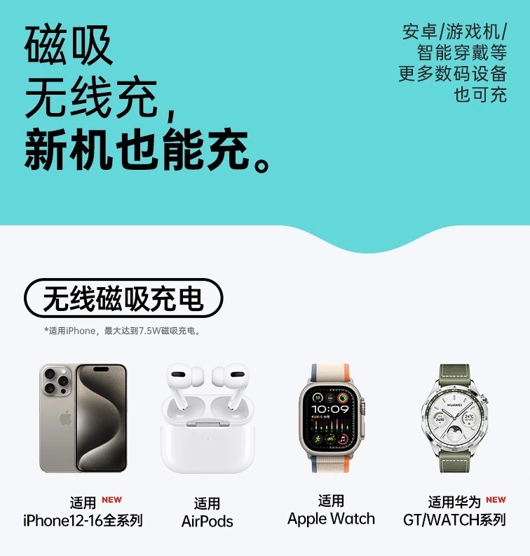 对于苹果多设备用户而言,磁吸充电宝新品在满足多设备充电的基础上,兼具外观轻巧便携,能轻松放入口袋或包包,携带无负担;拥有 10000mAh大容量,足以应对长时间的外出需求;它的出现,不仅是一个充电宝,更是一个能够完美适配苹果多种设备充电的解决方案,为苹果用户提供了更多的选择和便利。