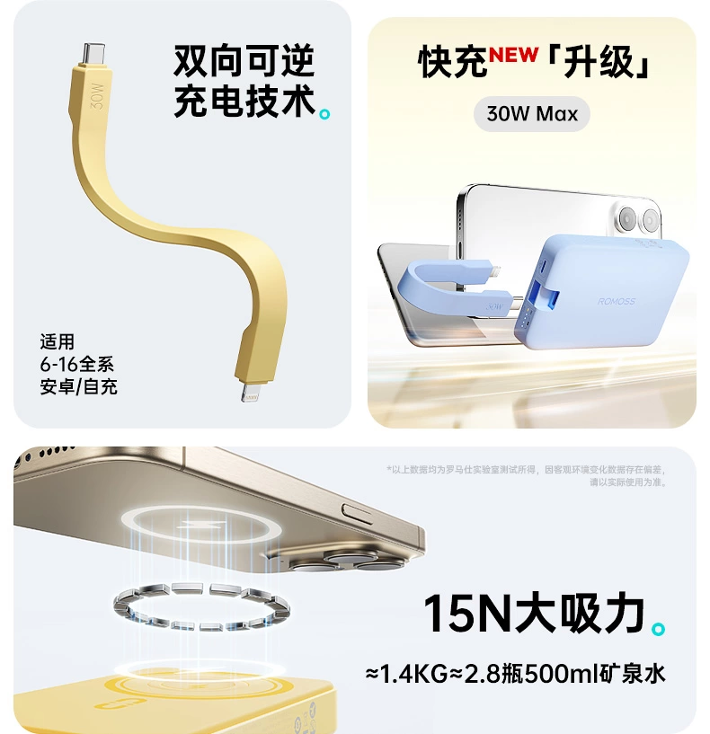 另外值得一提的是,磁吸充电宝新品还应用了罗马仕独家“一线三充”专利技术,使其也能兼容市面上主流的安卓设备,甚至能够为一些手持智能产品和智能穿戴设备提供充电支持,真正实现了一机在手,所有设备充电无忧的便捷体验。这种广泛的兼容性,使得用户无论使用的是苹果还是安卓设备,都能轻松应对。
