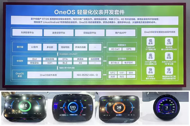 电动车的仪表盘是骑行者获取车辆信息、状态、性能等最直观的可视化平台,需具备高实时、高稳定、高可靠、高流畅等特点。此次摩博会上,中移物联与恒石智能展出的智能彩屏仪表全部采用国产工业级HMI芯片Model系列(Model3、Model4、Model3C、Model3A)。该系列芯片基于RISC-V开放生态,具备高算力平头哥内核,能够实现60FPS高流畅度显示。中移物联OneOS以其高效能、低资源占用和高度安全性,与Model系列芯片深度融合,打造了“国产芯片+国产操作系统”高速度、高安全的国产彩屏仪表解决方案,并在成本控制上取得了显著成效,打破了超高安全性智能仪表百元级成本线。