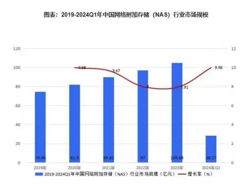 国内NAS市场规模也同样不容小觑,根据智研瞻今年6月发布的报告显示,2019年中国NAS行业市场规模为74.46亿元;2024年Q1的NAS行业市场规模28.27亿元,同比增长9.98%。预测期内,2024-2030年中国NAS行业市场规模增长率在7.18%-10%。其中,2030年的中国NAS行业市场规模将达到174.72亿元,同比增长7.84%。
