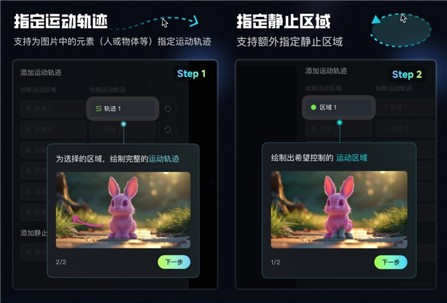 本次升级,可灵AI还带来了强大的“运动笔刷”功能,大幅提升了图生视频时创作者对运动效果的控制能力。“运动笔刷”功能支持为图片中的元素(人或物体等)指定运动轨迹,用户只需将图片中需要控制运动方向的部分勾勒出来,然后画一个示意运动方向箭头,就可实现精准运动控制。该功能支持上传图片后最多为图中的 6 个元素(人或物体等)指定运动轨迹。此外,还可以为某些元素额外指定静止区域,让视频内容有更好的运动控制及运动表现。