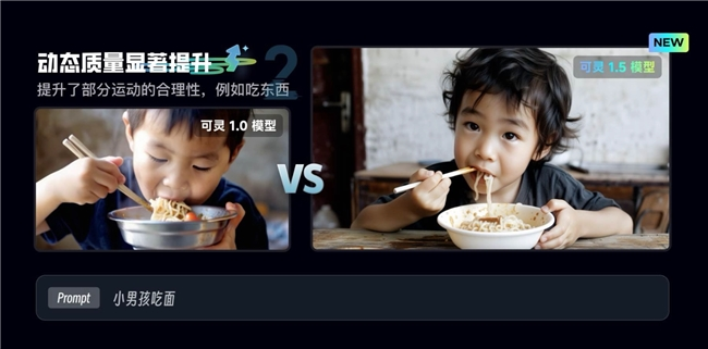 在动态质量方面,新模型也有显著提升。例如,对比可灵AI此前火爆出圈的吃面案例,输入提示词“小男孩吃面”,右侧1.5模型生成的视频中,面条从被夹起到入口这一过程中,在弹性、垂坠感等方面有非常真实的物理表现,同时小男孩右手握住筷子和吃面时的咀嚼动作,也都较左侧1.0模型更加自然流畅,整体运动合理性大大增强。