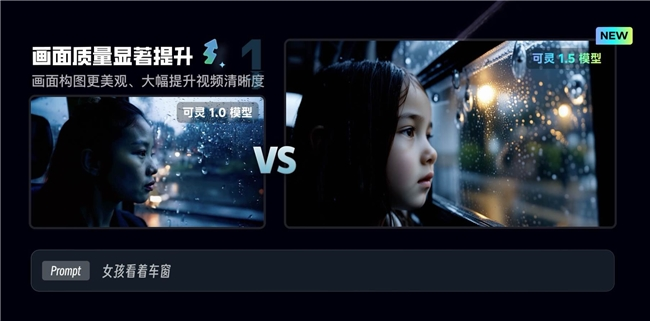 此前,可灵1.0模型在高品质模式可生成720p视频,本次升级后,1.5模型高品质模式可直接生成1080p高清视频。通过输入提示词“女孩看着车窗”,对比左右两个版本视频生成的效果,可以发现,可灵1.5新模型的画面质量提升显著:画面清晰度有直观可感,画面右侧的女孩面部细节更清晰丰富,车窗的水雾、整体光影表现等也都更加出色。同时,新模型下画面整体构图也进一步优化,画面更具美感。