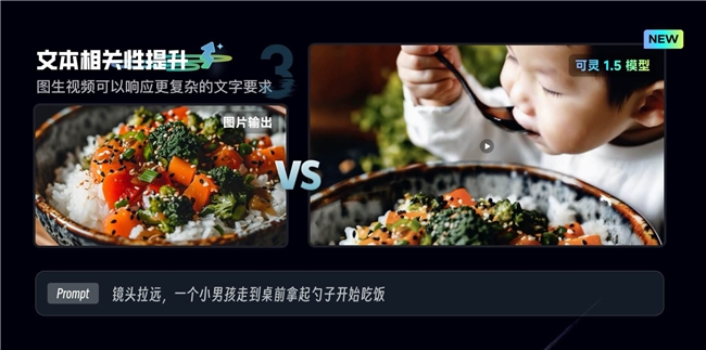 在图生视频方面,可灵全新的1.5模型可以响应更复杂的文本描述要求。例如通过一张没有人物的食物照片和提示词“镜头拉远,一个小男孩走到桌前拿起勺子开始吃饭”。在生成的视频中,随着镜头的微微晃动,一个勺子“入场”,然后画面聚焦到握着勺子的小男孩,看他将一勺饭菜送到嘴里,勺子在碗里拨开饭粒的细节也都被细致地呈现了出来,显示出强大的图生视频理解能力。