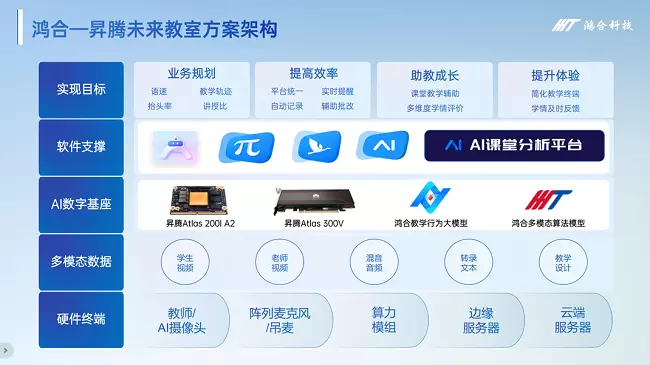 在此背景下,鸿合科技基于昇腾人工智能技术,联合在教育创新融合应用方面发布多项成果。在今年4月第83届中国教育装备展上,鸿合科技就与昇腾AI联合发布了AI算力引擎——鸿华,以及为行业贯穿“课前备课-课中授课-课后教研”全环节的鸿合科技-昇腾AI课堂分析应用联合解决方案。在此基础上,本次更是针对“量化难,效率低,经验少,体验差”这四大典型教育教学痛点隆重推出了教育AI新品——未来教室解决方案。