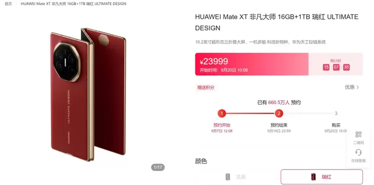 据早前相关媒体报道,华为Mate XT非凡大师的首批备货量预计为100万台。自9月7日开放预订以来,截至9月19日19:00,短短12天内,官网的预约人数突破660万,远超预期。这一火爆程度不仅凸显了华为在消费者心中的地位,也反映了市场对于高端智能设备的需求日益增长。