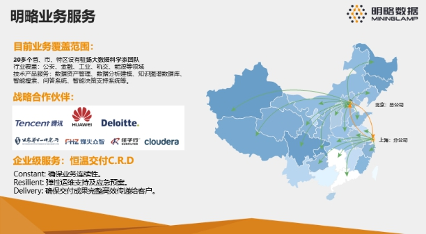 “信息产业归根结底是服务业,最终的用户交互界面,也就是服务交付的体验,决定了项目、产品的成败。一个有温度的交付服务,能大幅提高大数据项目落地的成功率。如果可以有握手的界面,会更容易。”唐日新表示。明略数据服务坚持恒温交付C.R.D理念(Constant: 确保业务连续性;Resilient: 弹性运维支持及应急预案;Delivery: 确保交付成果完整高效传递给客户)。具体而言,首先是本地化的交付,比如陕西的项目就由陕西当地的团队负责。目前明略数据在河北、武汉、南京等地都有区域中心或交付中心,从本地吸纳人才,向当地用户交付大数据项目。其次,在人才梯度队伍的建设方面,明略数据注重培养和孵化当地的人才,完成本地化的增值服务。再次,明略数据也会与地方政府产业基金合作,共建当地的区域中心,在承担社会责任的同时,也会对当地政府提出要求,推动政府职能的转变。