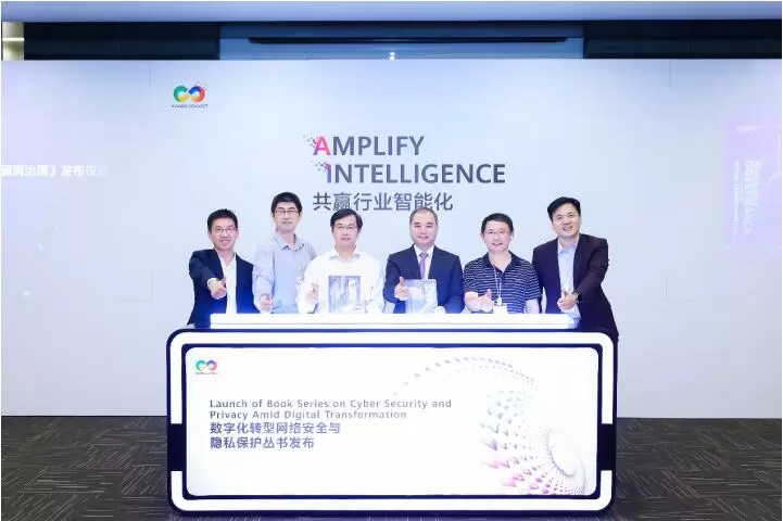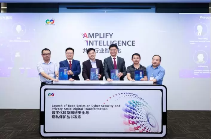 嘉宾华为首席隐私保护专家罗俊、华为网络安全与隐私保护官杨晓宁、华为企业业务首席网络安全与隐私保护官王生牛、中国科学技术大学网络空间安全学院院长俞能海、中国科学技术大学出版社总编辑李攀峰、中国科学技术大学网络空间安全学院副教授张弛(从左至右)共同发布《数字化转型下的隐私治理》书籍。