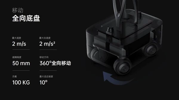 PUDU D7具备类人的构型,底部配备通用的移动能力,底盘支持360度全向移动,最大速度可达2米/秒,并能在最大10度的斜坡上稳定运行。高机动性能使其在狭小和高动态环境中也能自如穿行,例如在繁忙的餐厅和工业车间中高效作业。此外,D7的电池容量超过1KWh,可持续工作超过8小时。