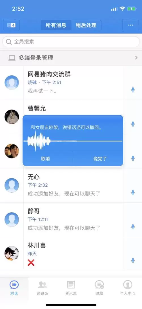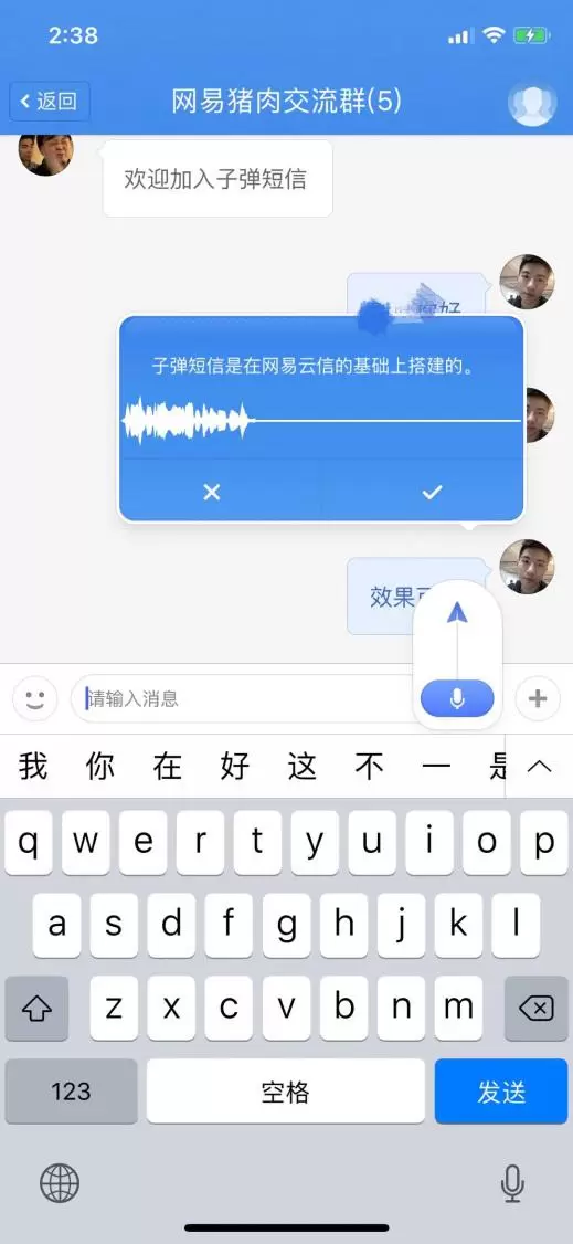 子弹短信用「语音+文字」方式改进了这个问题。子弹短信的输入框里有个蓝色按钮,点击就可以给好友发送语音,并优先自动转化为文字,在接收的那一端显示的就是文字消息,消息传递使用了云信的自定义消息功能(自定义消息还可以实现红包、骰子、阅后即焚功能),对话框左下角有个小的播放按钮,点击就可以播放语音。并且语音提示之后能确认和取消值得肯定。
