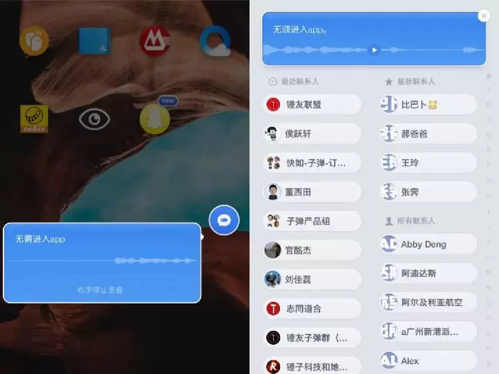 开启全局悬浮球功能,用户无需进入App,在手机桌面即可按住悬浮钮直接说话(录制语音),然后直接就会弹出最近常用联系人以及所有联系人,只要选择联系人即可发送(通过云信SDK发送消息),给用户加速的信息输入和发送体验。发送信息之后即可回到原来的使用界面,不影响任何操作