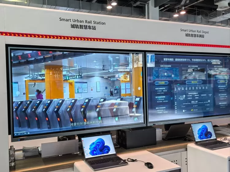 在交通展台,集中展示了OpenHarmony在公路、智慧车站等场景的前沿创新。在公路场景中,通过分布式软总线等技术,OpenHarmony让公路场景的多种设备互联互通,做到了隧道的安全运营管控和收费站的精准收费服务,让传统隧道和收费站体验“焕然一新”。OpenHarmony让设备“统一语言”,通过“新硬件”、“新交互”、“新服务”,提升了公路场景的安全性和运行效率,打造公路行业自主可控的数字化操作系统。