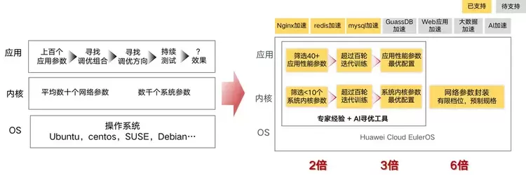此外,与常规的云服务器不同,Flexus X 实例针对多种业务场景下的常用应用提供了一键加速能力,从操作系统选型到内核参数配置再到应用参数配置均融合了华为云工程师多年的调优经验,因此在应用层面性能提升极为明显,用更少的 Flexus X 实例,就能承担一样的关键业务应用负载,从而大幅度节省成本。
