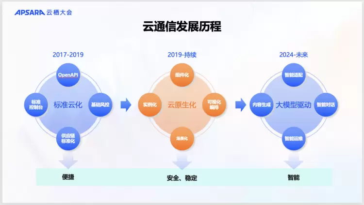 阿里云通信业务负责人孔繁盛介绍了阿里云通信的技术发展历程,从2017年通过标准云化、以API的方式为客户提供服务,到2019年开始使用云原生形式,通过实例化和组件化来解决客户的个性需求,再到近两年,更多地将AI和大模型应用于云通信领域,解决人员弹性、知识沉淀等问题,逐步重塑了云通信的业务流程,提升了整个服务过程的智能化水平。