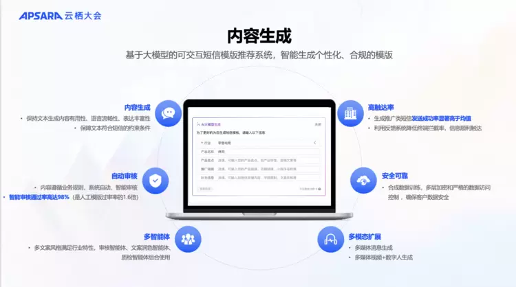 云通信作为一种载体,其复杂度不断提高,正在从单一媒体向多媒体消息发展,从单向式向交互式方向发展,承载着更多的功能类服务,呈现出与大模型技术的融合发展趋势。阿里云通信基于对宏观趋势和市场痛点的研判,推出了“内容生成”、“智能语音”、“效果分析”等基于大模型的能力,也树立了自身智能通信的发展里程碑。