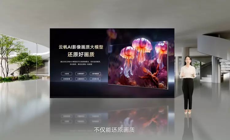 而随着用户唤醒,这幅画卷瞬间转变为一台强大的智能电视,呈现顶级画质表现力。它搭载的云帆AI影像画质大模型和AI MiniLED光学系统,并且在2400nits黄金亮度的加持下,画面恰到好处、够亮但不刺眼。不管是深邃夜空的繁星点点,还是广袤草原的绿意盎然,都能精准还原,让用户感受前所未有的视觉震撼。