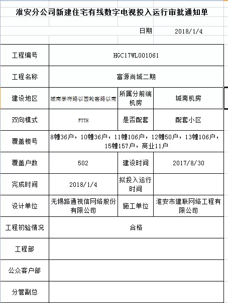 记者了解到,江苏省广电有线信息网络股份有限公司淮安分公司自2008年转型为国企以后,面临大量模拟电视转数字电视的空口,工程建设量剧增,原有的人工记录办法就会显得有些滞后。2013公司接触到《勤哲Excel服务器软件》,发现勤哲不但简单易学,还可以根据公司自身情况进行独特设计来满足管理需求,并迅速引进。短时间内完成了从工程立项到工程转固一套全面流程,实现无纸化办公,简化了流程,提升了效率,并一直使用至今。