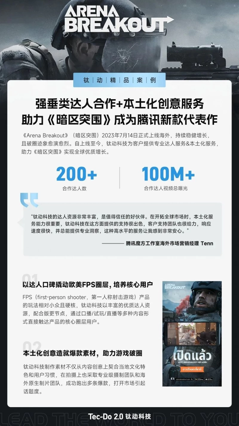 钛动科技为《暗区突围》服务持续超一年时间,合作超200位达人,累计曝光量超1亿。通过专业本土团队和精准达人策略,助力客户在多个国家市场实现了高质量推广,以内容为导向建立起自己的社区,成为腾讯游戏代表作之一。