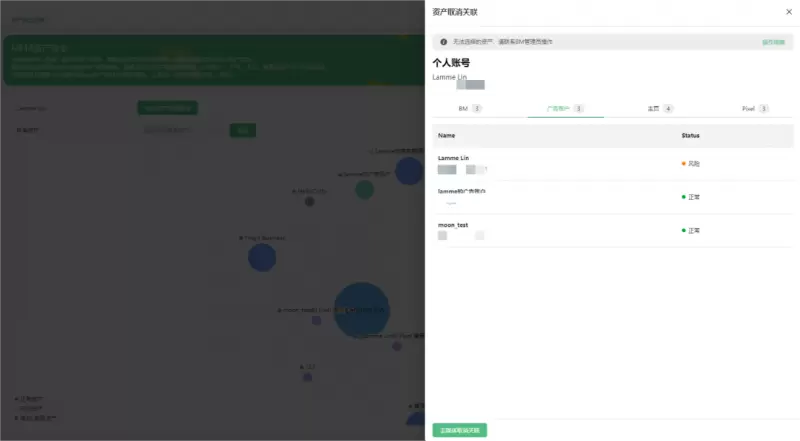 TopTou基于AI监控功能开发的【资产状态监控】,将会对已授权的BM、个号、广告账户的状态进行监控,一旦发现出现异常如被封或受限,TopTou会对应作出相应的行动,如会给你发送通知或进行取消关联。