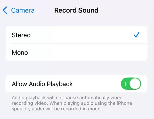 要使用此功能,请打开iPhone的设置,导航至相机部分,点击“录制声音”,然后打开“允许音频回放”开关。激活该功能后,在相机应用中录制视频时,音频将继续播放,如果音频通过扬声器播放,它将被iPhone的麦克风摄取并以单声道的形式与视频一同录制。如果音频通过耳机播放,则不会被录制。