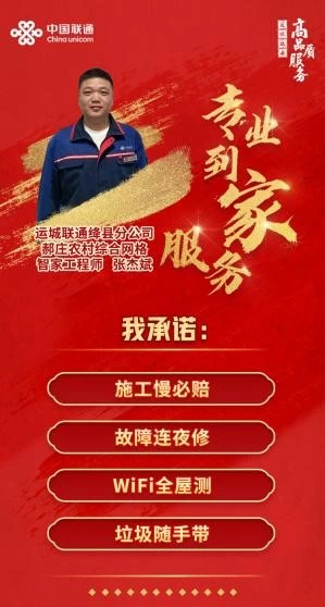 正是有了张杰斌这样优秀的智家工程师,联通的服务不仅仅是技术的传递,更成为了温暖人心的力量。他们以匠心编织着智慧生活的网络,以真情书写着服务的华章。张杰斌的事迹激励着每一位联通人,我们相信,在这个快速发展的时代,技术的温度来自于人的关怀,而“联通好服务,用心为客户”的承诺,正通过每一位员工的汗水与微笑,深深根植于万千客户的心中。