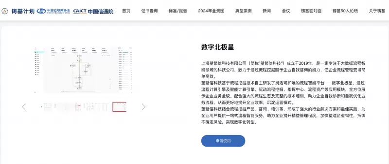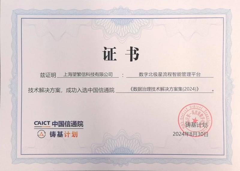 近日,上海望繁信科技有限公司(以下简称“望繁信科技”)的数字北极星流程智能管理平台,在中国信息通信研究院(以下简称“信通院”)的评选中,荣获2024年度数据治理技术解决方案奖项,并入选《高质量数字化转型产品及服务全景图》。同时,望繁信科技的数字北极星平台成功首批入驻信通院铸基计划应用商店。这一荣誉不仅突显了望繁信科技在流程智能和流程挖掘领域的技术领先性,更表明其数字北极星平台在推动企业数字化转型中的重要地位。