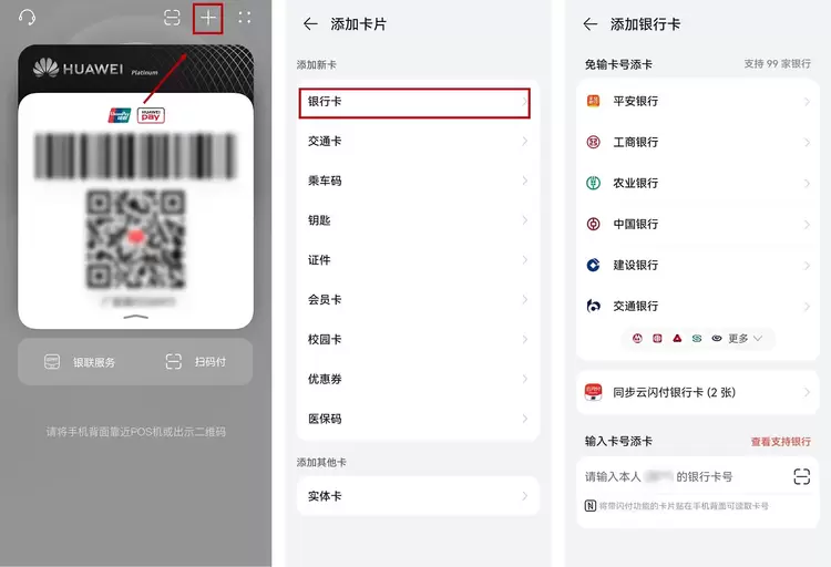 添加/开通多张卡片,每次识别的时候还要筛选卡?不管在华为钱包中添加多少张不同类型的卡,用户都无需担心刷卡步骤繁琐。华为钱包拥有“智闪卡”功能,靠近NFC识别区域后,系统会自动识别当前场景需要用到的卡片,并完成调用,全程无需手动选卡;当然如需要选卡,双击电源键则可调出所有添加的卡,用户可根据使用场景选择。而且绑定电子卡的步骤也非常简单,拿起华为手机,双击电源键的“+”,选择需要的电子卡片,验证身份信息后即可开卡。