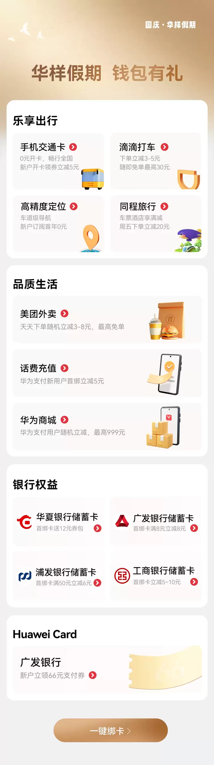 现在进入华为钱包APP,点击首页“华样假期,钱包有礼”,即可查看更多国庆优惠礼包。