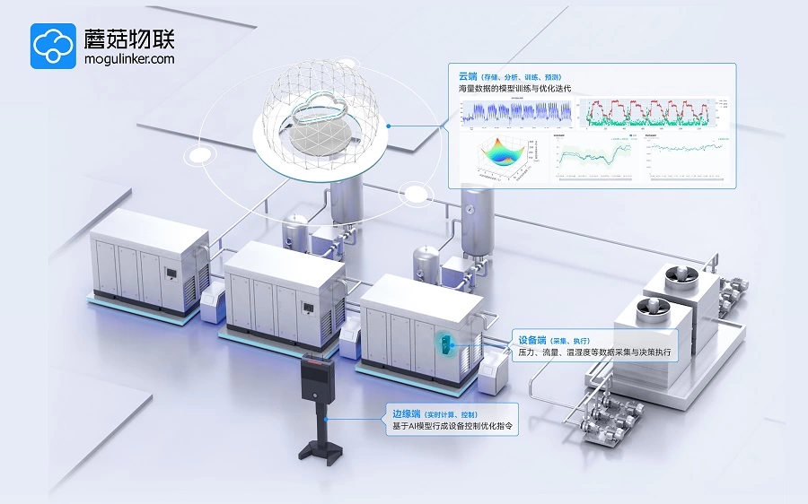 在节能降碳的制造环节中,海信视像江门工厂通过由蘑菇物联提供的AI云智控节能管理系统,通过灵知AI大模型代替人工经验管理和控制,实现了空压站和制冷站等公辅车间的数智化转型与节能降碳。